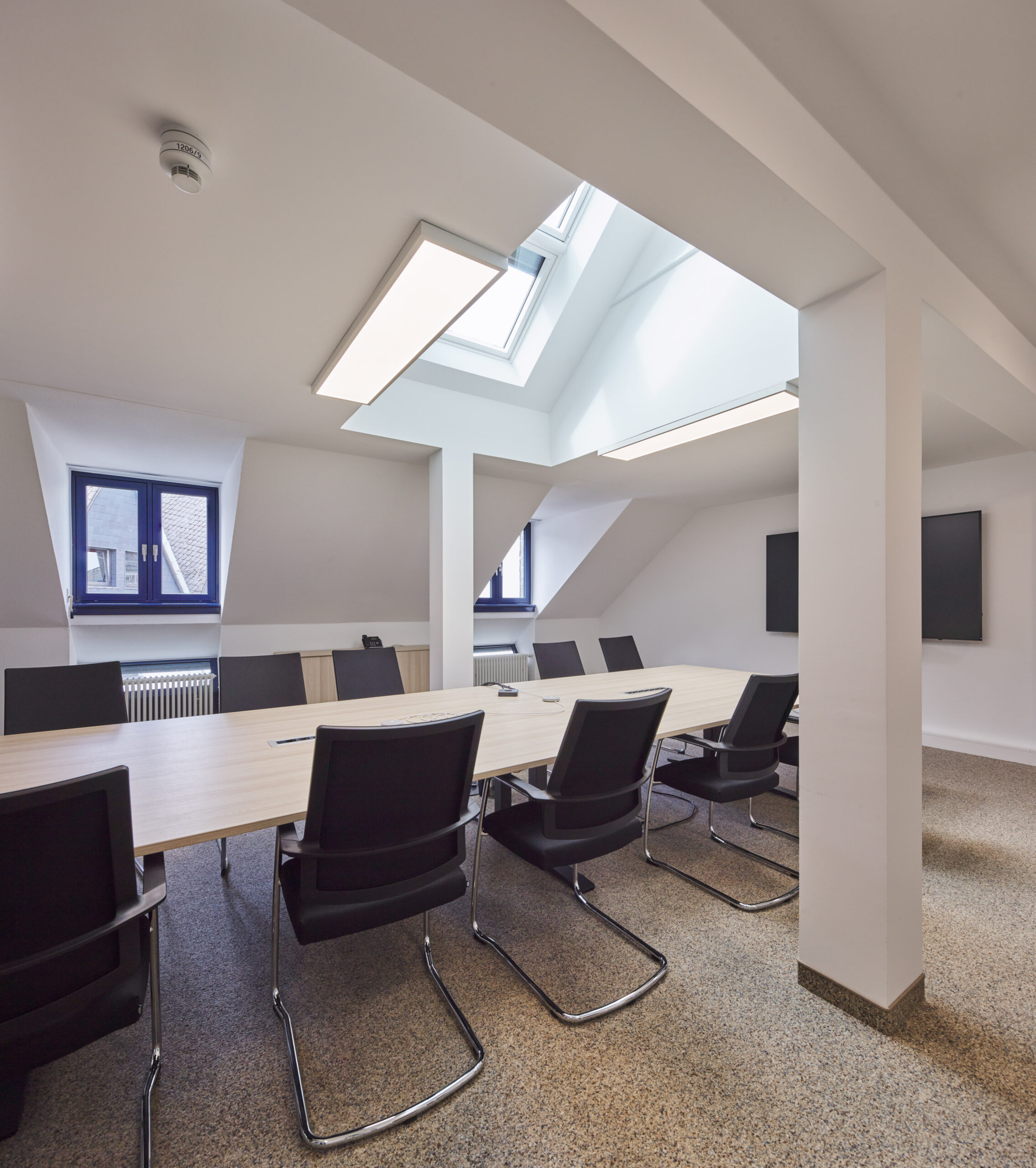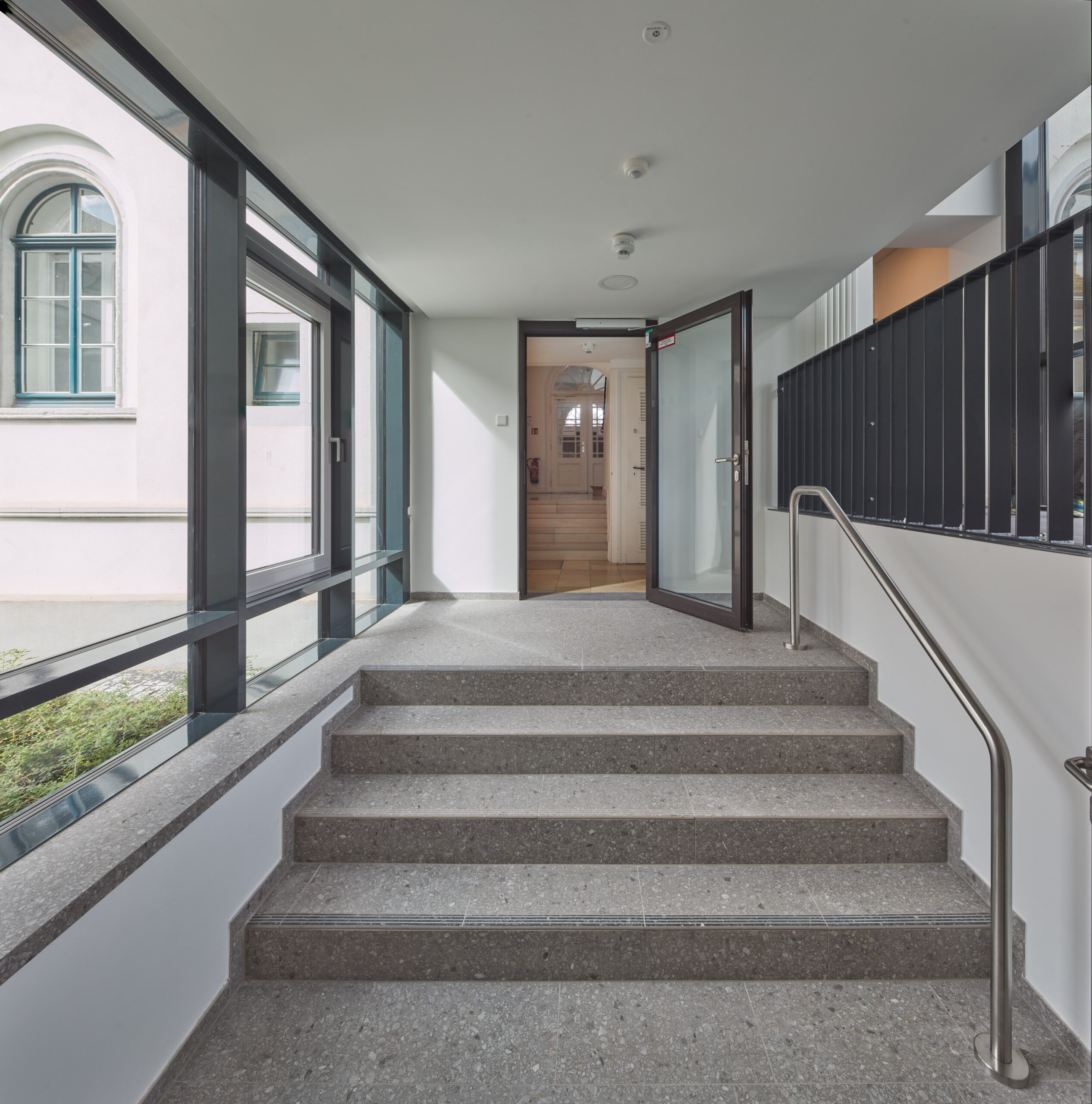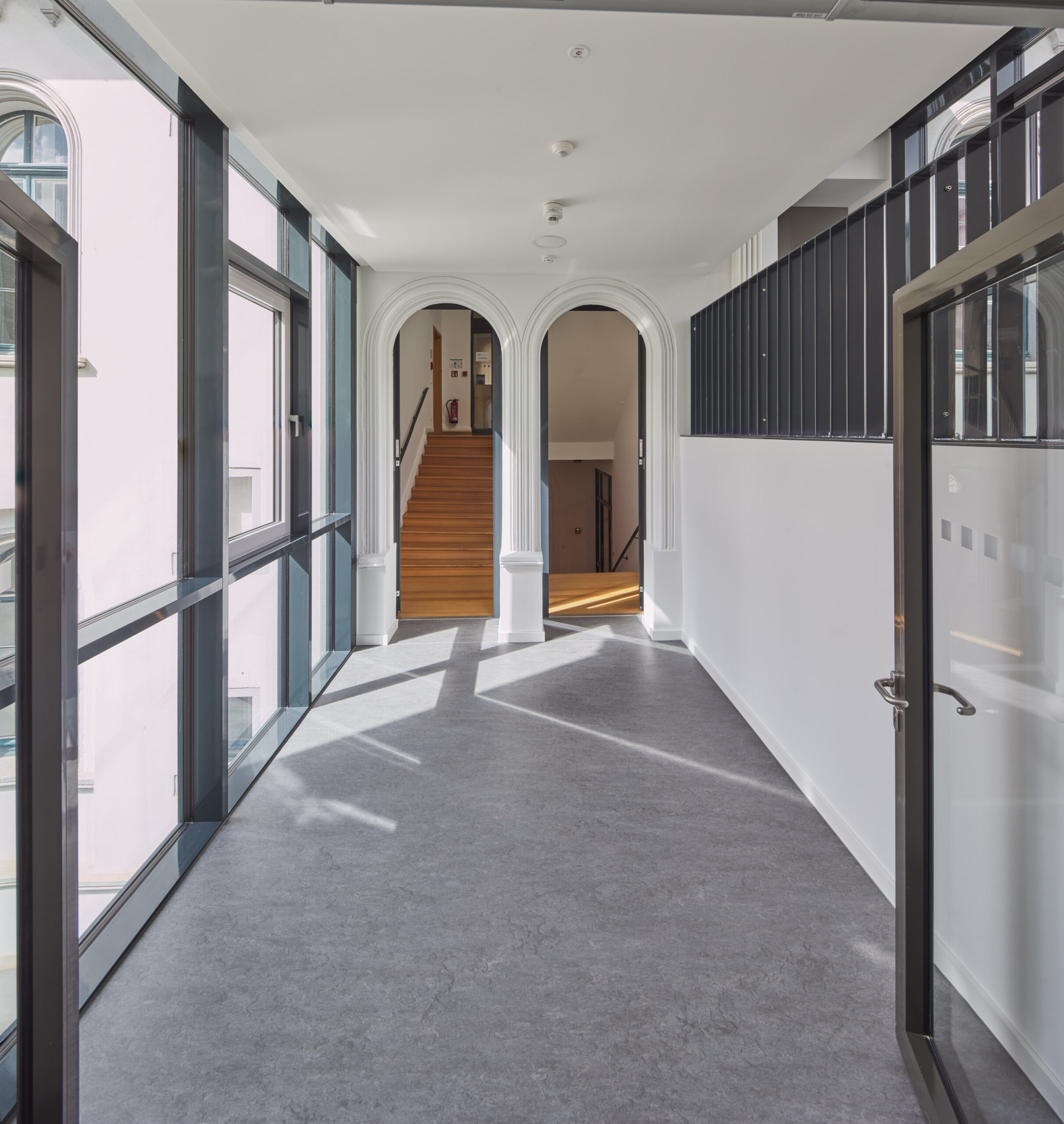 Über den neuen Haupteingang in der Fuge zwischen Alt und Neu werden alle Räume erschlossen. In Obergeschossen entstehen zusätzlich kleine Besprechungsräume. Die bestehenden Dachgeschossflächen werden umgebaut.