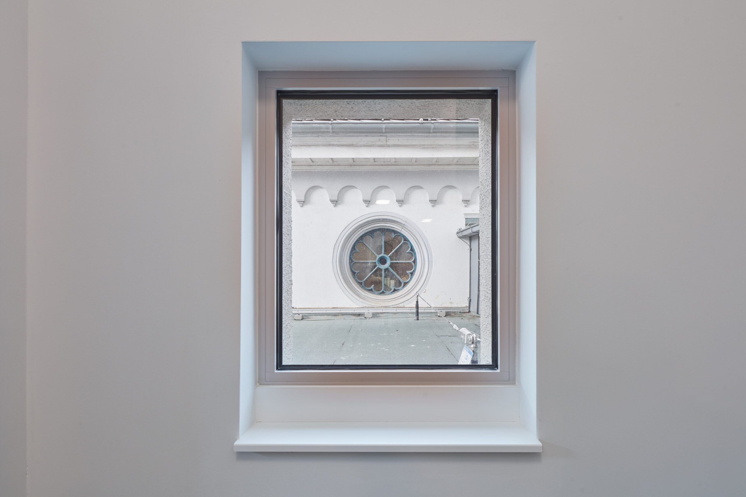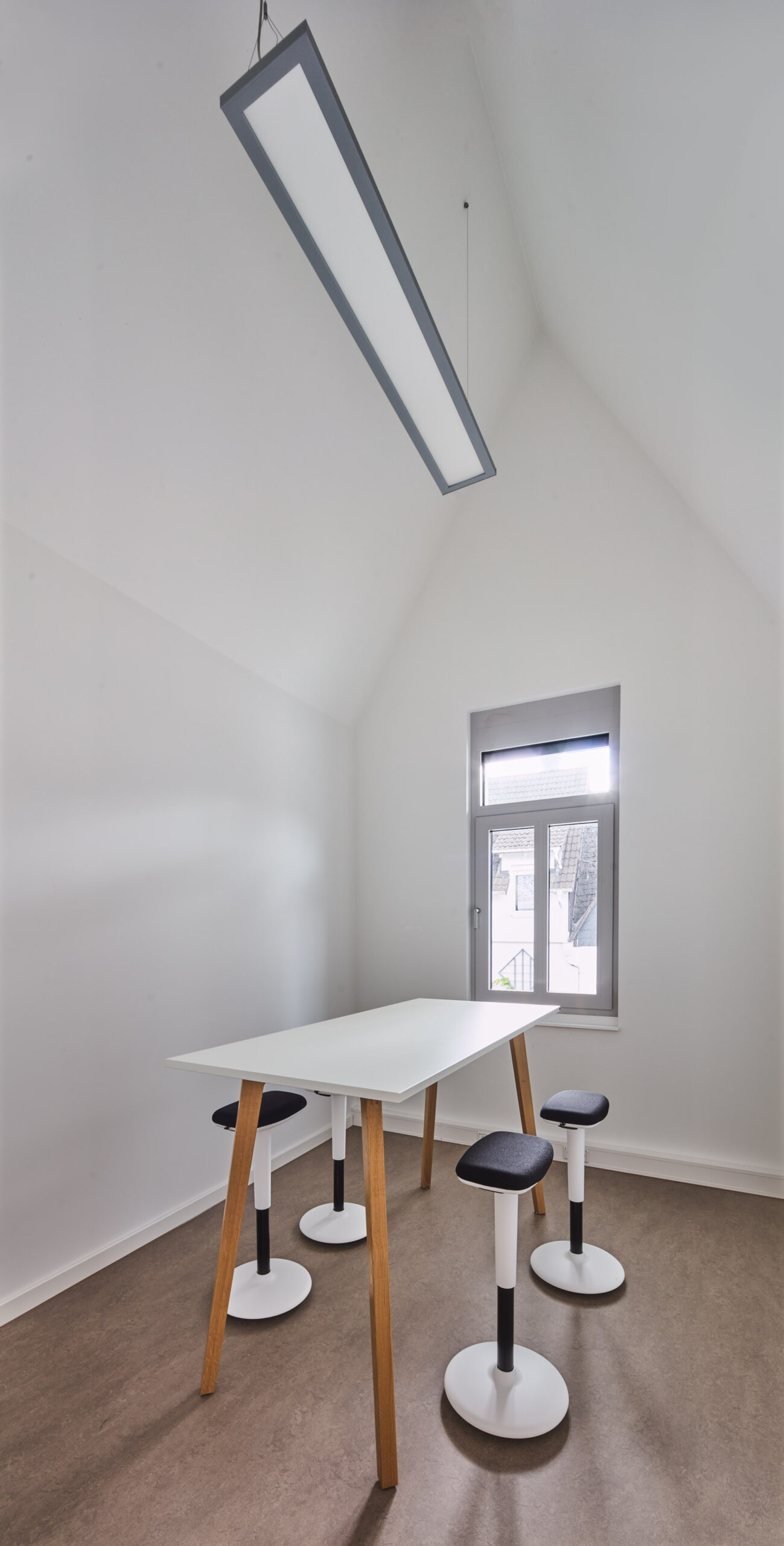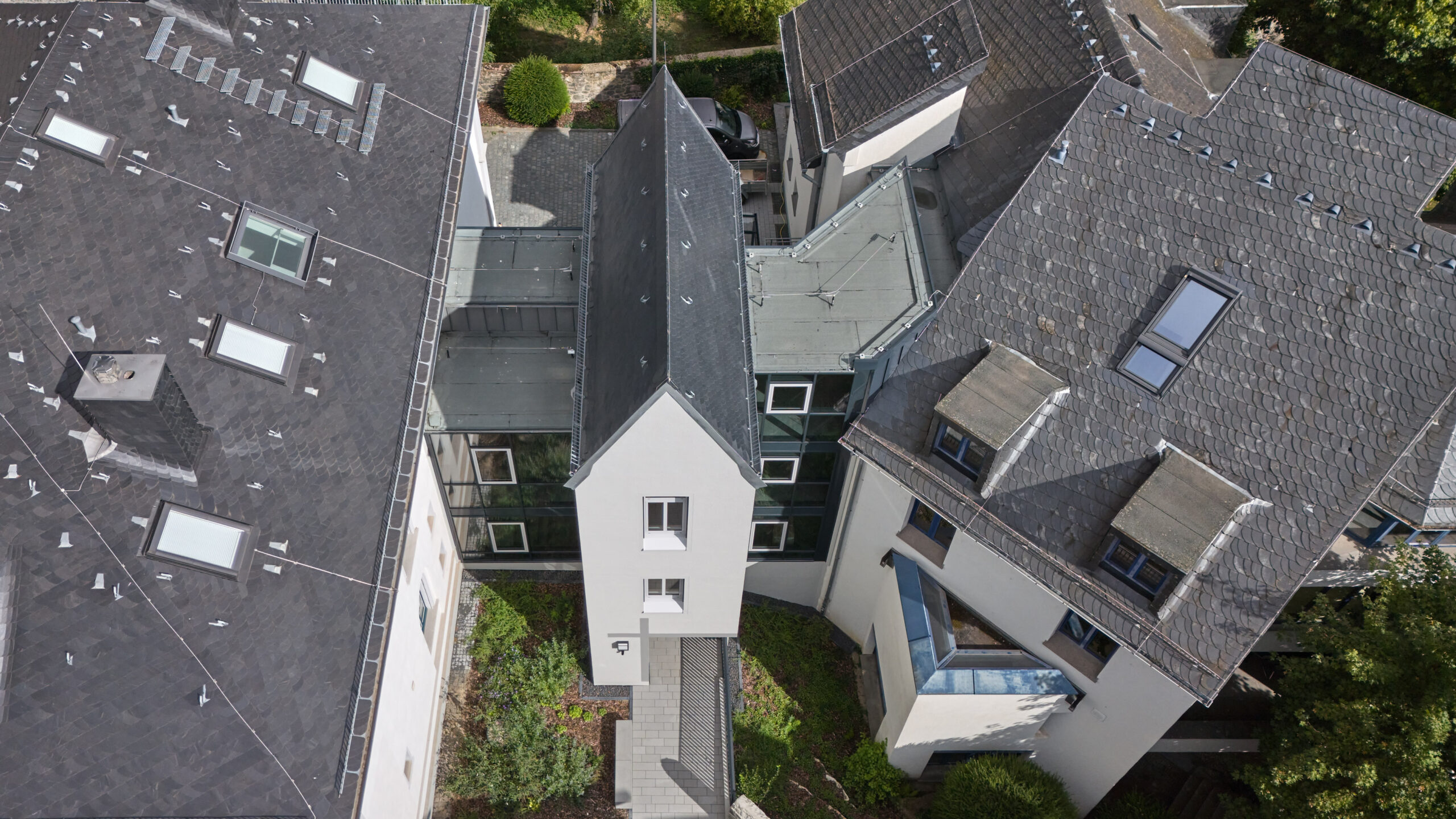 Über den neuen Haupteingang in der Fuge zwischen Alt und Neu werden alle Räume erschlossen. In Obergeschossen entstehen zusätzlich kleine Besprechungsräume. Die bestehenden Dachgeschossflächen werden umgebaut.